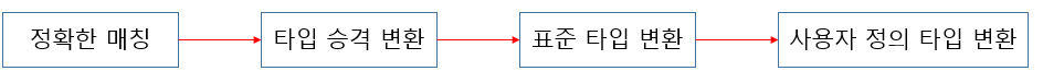 - 정확한 매개변수 타입 일치: 호출 인자 타입과 매개변수 타입이 정확히 일치하는 경우