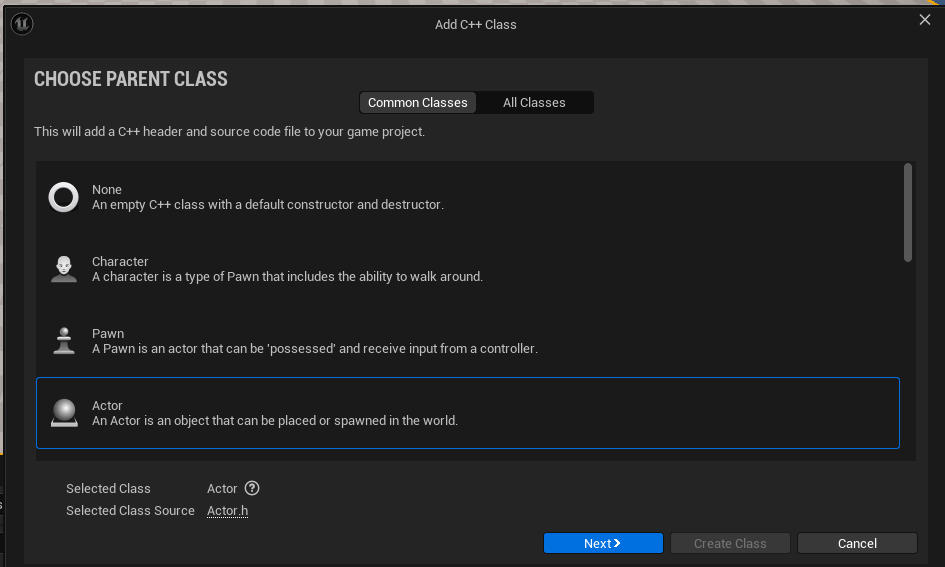 - 새로운 Actor를 만들기 위해 Tools에서 'New C++ Class'를 선택